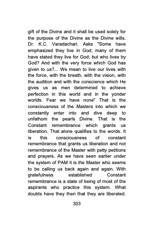 gift of the Divine and it shall be used solely for the purpose of the Divine as the Divine wills. Dr. K.C. Varadachari. Asks "Some have emphasized they live in God; many of them have stated they live for God; but who lives by God? And with the very force which God has given to us?... We mean to live our lives with the force, with the breath, with the vision, with the audition and with the conscience which He gives us as men determined to achieve perfection in this world and in the yonder worlds. Fear we have none" That is the consciousness of the Masters into which we constantly enter into and dive deep to unfathom the pearls Divine. That is the Constant remembrance which grants us liberation. That alone qualifies to the words. It is this consciousness of constant remembrance that grants us liberation and not remembrance of the Master with petty petitions and prayers. As we have seen earlier under the system of PAM it is the Master who seems to be calling us back again and again. With gratefulness established Constant remembrance is a state of being of most of the aspirants who practice this system. What doubts have they then that they are liberated.