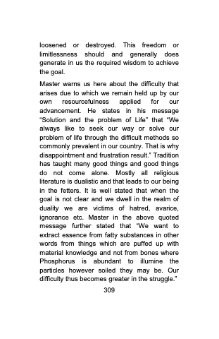 Master warns us here about the difficulty that arises due to which we remain held up by our own resourcefulness applied for our advancement. He states in his message ―Solution and the problem of Life‖ that ―We always like to seek our way or solve our problem of life through the difficult methods so commonly prevalent in our country. That is why disappointment and frustration result.‖ Tradition has taught many good things and good things do not come alone. Mostly all religious literature is dualistic and that leads to our being in the fetters. It is well stated that when the goal is not clear and we dwell in the realm of duality we are victims of hatred, avarice, ignorance etc. Master in the above quoted message further stated that ―We want to extract essence from fatty substances in other words from things which are puffed up with material knowledge and not from bones where Phosphorus is abundant to illumine the particles however soiled they may be. Our difficulty thus becomes greater in the struggle.‖