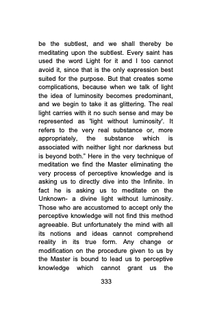 be the subtlest, and we shall thereby be meditating upon the subtlest. Every saint has used the word Light for it and I too cannot avoid it, since that is the only expression best suited for the purpose. But that creates some complications, because when we talk of light the idea of luminosity becomes predominant, and we begin to take it as glittering. The real light carries with it no such sense and may be represented as 'light without luminosity'. It refers to the very real substance or, more appropriately, the substance which is associated with neither light nor darkness but is beyond both.‖ Here in the very technique of meditation we find the Master eliminating the very process of perceptive knowledge and is asking us to directly dive into the Infinite. In fact he is asking us to meditate on the Unknown- a divine light without luminosity. Those who are accustomed to accept only the perceptive knowledge will not find this method agreeable. But unfortunately the mind with all its notions and ideas cannot comprehend reality in its true form. Any change or modification on the procedure given to us by the Master is bound to lead us to perceptive knowledge which cannot grant us the