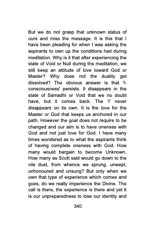 But we do not grasp that unknown status of ours and miss the message. It is this that I have been pleading for when I was asking the aspirants to own up the conditions had during meditation. Why is it that after experiencing the state of Void or Null during the meditation, we still keep an attitude of love toward God or Master? Why does not the duality get dissolved? The obvious answer is that 'I- consciousness' persists. It disappears in the state of Samadhi or Void that we no doubt have, but it comes back. The 'I' never disappears on its own. It is the love for the Master or God that keeps us anchored in our path. However the goal does not require to be changed and our aim is to have oneness with God and not just love for God. I have many times wondered as to what the aspirants think of having complete oneness with God. How many would bargain to become Unknown. How many as Scott said would go down to the vile dust, from whence we sprung, unwept, unhonoured and unsung? But only when we own that type of experience which comes and goes, do we really imperience the Divine. The call is there, the experience is there and yet it is our unpreparedness to lose our identity and