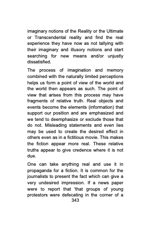 The process of imagination and memory combined with the naturally limited perceptions helps us form a point of view of the world and the world then appears as such. The point of view that arises from this process may have fragments of relative truth. Real objects and events become the elements (information) that support our position and are emphasized and we tend to deemphasize or exclude those that do not. Misleading statements and even lies may be used to create the desired effect in others even as in a fictitious movie. This makes the fiction appear more real. These relative truths appear to give credence where it is not due.