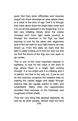 good. But then when difficulties and miseries engulf him there develops an area where there is a crack in the door of ego. And it is through that crack alone does the bright light come and it is not all that pleasant in the beginning; it is in fact very irritating. Slowly when the cracks increase and more light starts pouring in through the crevices in the Ego we start learning to look for the same with eagerness and in fact we wait for such light beams as may drown us. From this state we learn that the light is really inviting us to find our way out and we find the doors of the Ego are now open to go yonder.