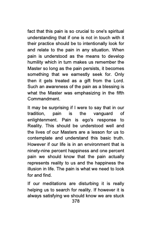 fact that this pain is so crucial to one's spiritual understanding that if one is not in touch with it their practice should be to intentionally look for and relate to the pain in any situation. When pain is understood as the means to develop humility which in turn makes us remember the Master so long as the pain persists, it becomes something that we earnestly seek for. Only then it gets treated as a gift from the Lord. Such an awareness of the pain as a blessing is what the Master was emphasizing in the fifth Commandment.