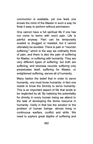 One cannot have a full spiritual life if one has not come to terms with one's pain. Life is painful anyway. Pain can be temporarily evaded or drugged or resisted, but it cannot ultimately be avoided. There is pain in "neurotic suffering," which is the way we ordinarily think of pain, and there is also the pain of suffering for Master, or suffering with humanity. They are very different types of suffering, but both are suffering; and whereas neurotic suffering only perpetuates itself, suffering for Master, or enlightened suffering, serves all of humanity.