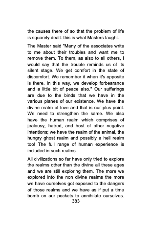 The Master said "Many of the associates write to me about their troubles and want me to remove them. To them, as also to all others, I would say that the trouble reminds us of its silent stage. We get comfort in the state of discomfort. We remember it when it's opposite is there. In this way, we develop forbearance and a little bit of peace also." Our sufferings are due to the binds that we have in the various planes of our existence. We have the divine realm of love and that is our plus point. We need to strengthen the same. We also have the human realm which comprises of jealousy, hatred, and host of other negative intentions; we have the realm of the animal, the hungry ghost realm and possibly a hell realm too! The full range of human experience is included in such realms.