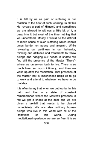 it is felt by us as pain or suffering is our reaction to the heat of such learning. In all this He reveals a part of Himself, and sometimes we are allowed to witness a little bit of it, a peep into it but most of the time nothing that we understand. Mostly it would be too difficult to make sense of such suffering which certain times border on agony and anguish. While reviewing our pettiness in our behavior, thinking and attitudes and treatments to fellow beings and hanging our heads in shame we find still the presence of the Master "There"- where we ourselves loath to live. There is so much love, so much intimacy, and then we wake up after the meditation. That presence of the Master that is imperienced helps us to go to work and attend to whatever we have to do that day.