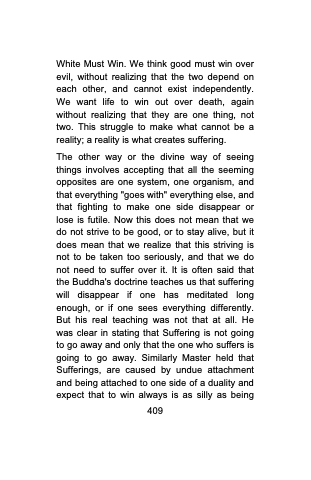 White Must Win. We think good must win over evil, without realizing that the two depend on each other, and cannot exist independently. We want life to win out over death, again without realizing that they are one thing, not two. This struggle to make what cannot be a reality; a reality is what creates suffering.