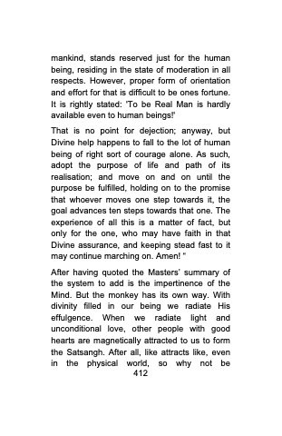 After having quoted the Masters‘ summary of the system to add is the impertinence of the Mind. But the monkey has its own way. With divinity filled in our being we radiate His effulgence. When we radiate light and unconditional love, other people with good hearts are magnetically attracted to us to form the Satsangh. After all, like attracts like, even