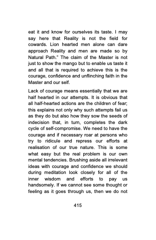 Lack of courage means essentially that we are half hearted in our attempts. It is obvious that all half-hearted actions are the children of fear; this explains not only why such attempts fail us as they do but also how they sow the seeds of indecision that, in turn, completes the dark cycle of self-compromise. We need to have the courage and if necessary roar at persons who try to ridicule and repress our efforts at realisation of our true nature. This is some what easy but the real problem is our own mental tendencies. Brushing aside all irrelevant ideas with courage and confidence we should during meditation look closely for all of the inner wisdom and efforts to pay us handsomely. If we cannot see some thought or feeling as it goes through us, then we do not