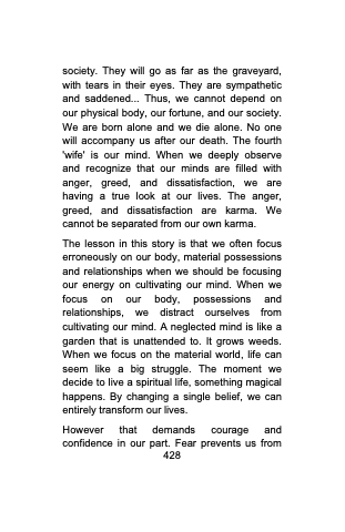 society. They will go as far as the graveyard, with tears in their eyes. They are sympathetic and saddened... Thus, we cannot depend on our physical body, our fortune, and our society. We are born alone and we die alone. No one will accompany us after our death. The fourth 'wife' is our mind. When we deeply observe and recognize that our minds are filled with anger, greed, and dissatisfaction, we are having a true look at our lives. The anger, greed, and dissatisfaction are karma. We cannot be separated from our own karma.