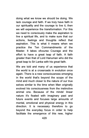 doing what we know we should be doing. We lack courage and faith. If we truly have faith in our spirituality and the courage to live it, then we will experience the transformation. For this we need to consciously make the aspiration to live a spiritual life, and to make sure that our actions, feelings and thoughts reflect that aspiration. This is what it means when we practice the Ten Commandments of the Master. It takes ofcourse Courage and the effort to have a great leap of faith. A faith greater than that of Lord Hanuman who did the great leap to Sri Lanka with his great faith.