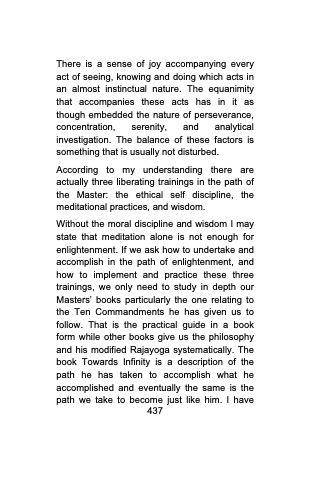 Without the moral discipline and wisdom I may state that meditation alone is not enough for enlightenment. If we ask how to undertake and accomplish in the path of enlightenment, and how to implement and practice these three trainings, we only need to study in depth our Masters‘ books particularly the one relating to the Ten Commandments he has given us to follow. That is the practical guide in a book form while other books give us the philosophy and his modified Rajayoga systematically. The book Towards Infinity is a description of the path he has taken to accomplish what he accomplished and eventually the same is the