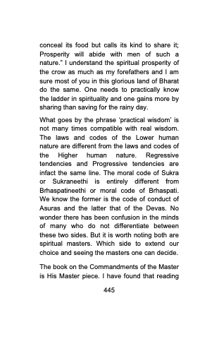 What goes by the phrase ̳practical wisdom‘ is not many times compatible with real wisdom. The laws and codes of the Lower human nature are different from the laws and codes of the Higher human nature. Regressive tendencies and Progressive tendencies are infact the same line. The moral code of Sukra or Sukraneethi is entirely different from Brhaspatineethi or moral code of Brhaspati. We know the former is the code of conduct of Asuras and the latter that of the Devas. No wonder there has been confusion in the minds of many who do not differentiate between these two sides. But it is worth noting both are spiritual masters. Which side to extend our choice and seeing the masters one can decide.