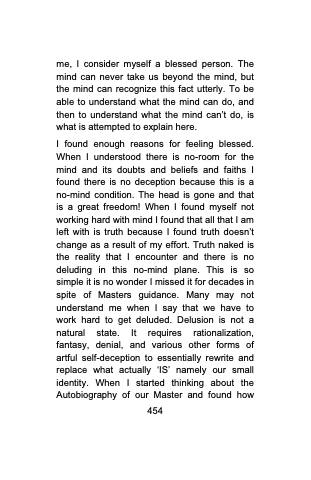 I found enough reasons for feeling blessed. When I understood there is no-room for the mind and its doubts and beliefs and faiths I found there is no deception because this is a no-mind condition. The head is gone and that is a great freedom! When I found myself not working hard with mind I found that all that I am left with is truth because I found truth doesn‘t change as a result of my effort. Truth naked is the reality that I encounter and there is no deluding in this no-mind plane. This is so simple it is no wonder I missed it for decades in spite of Masters guidance. Many may not understand me when I say that we have to work hard to get deluded. Delusion is not a natural state. It requires rationalization, fantasy, denial, and various other forms of artful self-deception to essentially rewrite and replace what actually ̳IS‘ namely our small identity. When I started thinking about the Autobiography of our Master and found how
