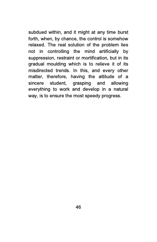 subdued within, and it might at any time burst forth, when, by chance, the control is somehow relaxed. The real solution of the problem lies not in controlling the mind artificially by suppression, restraint or mortification, but in its gradual moulding which is to relieve it of its misdirected trends. In this, and every other matter, therefore, having the attitude of a sincere student, grasping and allowing everything to work and develop in a natural way, is to ensure the most speedy progress.