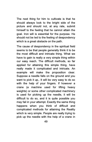 The cause of despondency in the spiritual field seems to be that people generally think it to be the most difficult and intricate thing. What we have to gain is really a very simple thing within our easy reach. The difficult methods, so far applied for attaining this simple thing, have really made it complicated and intricate. An example will make the proposition clear. Suppose a needle falls on the ground and you want to pick it up,. It will be very easy to do so with the help of your fingers. If however a crane (a machine used for lifting heavy weights) or some other complicated machinery is used for picking up the needle, it will be difficult to do so, and it is quite possible you may fail in your attempt. Exactly the same thing happens when you think of difficult and complicated methods for attaining the Reality which is very simple. People are really trying to pick up the needle with the help of a crane in
