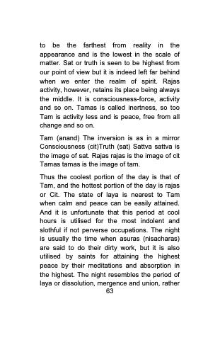 to be the farthest from reality in the appearance and is the lowest in the scale of matter. Sat or truth is seen to be highest from our point of view but it is indeed left far behind when we enter the realm of spirit. Rajas activity, however, retains its place being always the middle. It is consciousness-force, activity and so on. Tamas is called inertness, so too Tam is activity less and is peace, free from all change and so on.