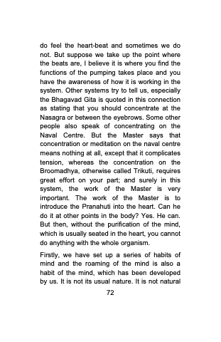 do feel the heart-beat and sometimes we do not. But suppose we take up the point where the beats are, I believe it is where you find the functions of the pumping takes place and you have the awareness of how it is working in the system. Other systems try to tell us, especially the Bhagavad Gita is quoted in this connection as stating that you should concentrate at the Nasagra or between the eyebrows. Some other people also speak of concentrating on the Naval Centre. But the Master says that concentration or meditation on the naval centre means nothing at all, except that it complicates tension, whereas the concentration on the Broomadhya, otherwise called Trikuti, requires great effort on your part; and surely in this system, the work of the Master is very important. The work of the Master is to introduce the Pranahuti into the heart. Can he do it at other points in the body? Yes. He can. But then, without the purification of the mind, which is usually seated in the heart, you cannot do anything with the whole organism.