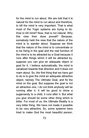 for the mind to run about. We are told that it is natural for the mind to run about and therefore, to kill the mind is very important. That is what most of the Yogic systems are trying to do. How to kill mind? Now, that is not natural. Why this view then does prevail? Because, somebody held the view that the nature of the mind is to wander about. Suppose we think that the nature of the mind is to concentrate or to be fixing in the goal and the real function of the mind is to be attracted by a Goal because it runs after things which it will be attracted by, suppose you can give an adequate object or goal for it, I believe automatically, the mind is canalized towards that direction and it does not roam about. So, the first thing that we have got to do is to give the mind an adequate attractive object, namely The Ultimate Goal, and fix the mind on the goal. But suppose the goal is not an attractive one, I do not think anybody will be running after it. It will be good to show a sugarcandy to a child, it runs after it. But what you give should be some other thing which is bitter. For most of us, the Ultimate Reality is a very bitter thing. We have not made it possible to be very attractive. So, some systems have tried to make God the most beautiful person,