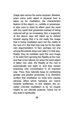 image also serves the same purpose. Besides, when some solid object in physical form is taken up for meditation, the characteristic feature of the object, i.e., solidity or grossness, is also sure to shed its effect upon the mind with the result that grossness instead of being reduced will go on increasing. But, a supporter of the above view will stand up to defend himself saying that it is not really the image that is being meditated upon but the reality at the root of it. But that may only be for the sake vain argumentation. In fact, perhaps not one among thousands does ever take it in that way. Really, they do meditate upon the very image in its solid form ignoring the Reality at the root, and that is but natural, for when the solid object is taken into view, the Reality at the root is automatically lost sight of, and they remain practicing only concentration in an imposed way. Thus, they naturally keep on contracting greater and greater grossness. It is, therefore evident that meditation on solid form causes adverse effect which hampers our march towards subtleness. In this respect, the so- called concrete meditation is by no means helpful to our ultimate purpose, hence not of any avail in spirituality.