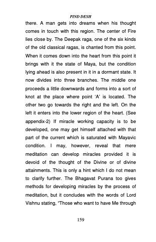 there. A man gets into dreams when his thought comes in touch with this region. The center of Fire lies close by. The Deepak raga, one of the six kinds of the old classical ragas, is chanted from this point. When it comes down into the heart from this point it brings with it the state of Maya, but the condition lying ahead is also present in it in a dormant state. It now divides into three branches. The middle one proceeds a little downwards and forms into a sort of knot at the place where point ‘A’ is located. The other two go towards the right and the left. On the left it enters into the lower region of the heart. (See appendix-2) If miracle working capacity is to be developed, one may get himself attached with that part of the current which is saturated with Mayavic condition. I may, however, reveal that mere meditation can develop miracles provided it is devoid of the thought of the Divine or of divine attainments. This is only a hint which I do not mean to clarify further. The Bhagavat Purana too gives methods for developing miracles by the process of meditation, but it concludes with the words of Lord Vishnu stating, “Those who want to have Me through