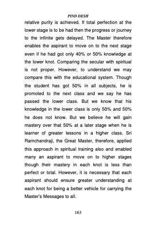 relative purity is achieved. If total perfection at the lower stage is to be had then the progress or journey to the infinite gets delayed. The Master therefore enables the aspirant to move on to the next stage even if he had got only 40% or 50% knowledge at the lower knot. Comparing the secular with spiritual is not proper. However, to understand we may compare this with the educational system. Though the student has got 50% in all subjects, he is promoted to the next class and we say he has passed the lower class. But we know that his knowledge in the lower class is only 50% and 50% he does not know. But we believe he will gain mastery over that 50% at a later stage when he is learner of greater lessons in a higher class. Sri Ramchandraji, the Great Master, therefore, applied this approach in spiritual training also and enabled many an aspirant to move on to higher stages though their mastery in each knot is less than perfect or total. However, it is necessary that each aspirant should ensure greater understanding at each knot for being a better vehicle for carrying the Master’s Messages to all.