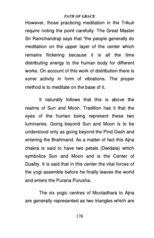However, those practicing meditation in the Trikuti require noting the point carefully. The Great Master Sri Ramchandraji says that “the people generally do meditation on the upper layer of the center which remains flickering because it is all the time distributing energy to the human body for different works. On account of this work of distribution there is some activity in form of vibrations. The proper method is to meditate on the base of it.