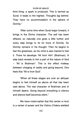 “After some time when Surat leaps forward, it brings in the Divine character. The self has been effaced, so naturally one goes a little further and every step brings to its lot more of Divinity. So Divinity remains in his thought. Then he begins to feel the greatness, as his mind is also trained to feel it. There he develops “All from Him” (Brahman). A step back reveals to him a part of the nature of God – “All is Brahman”. This is the effect midway between charging of reality and going beyond. One feels that “All is from God”.