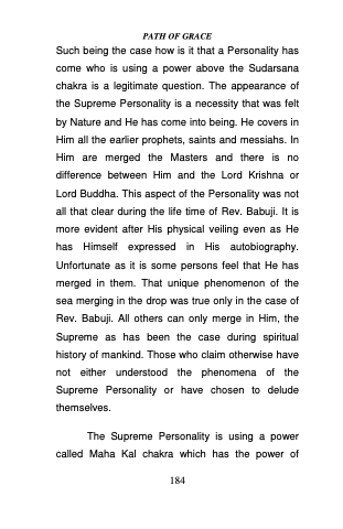 Such being the case how is it that a Personality has come who is using a power above the Sudarsana chakra is a legitimate question. The appearance of the Supreme Personality is a necessity that was felt by Nature and He has come into being. He covers in Him all the earlier prophets, saints and messiahs. In Him are merged the Masters and there is no difference between Him and the Lord Krishna or Lord Buddha. This aspect of the Personality was not all that clear during the life time of Rev. Babuji. It is more evident after His physical veiling even as He has Himself expressed in His autobiography. Unfortunate as it is some persons feel that He has merged in them. That unique phenomenon of the sea merging in the drop was true only in the case of Rev. Babuji. All others can only merge in Him, the Supreme as has been the case during spiritual history of mankind. Those who claim otherwise have not either understood the phenomena of the Supreme Personality or have chosen to delude themselves.