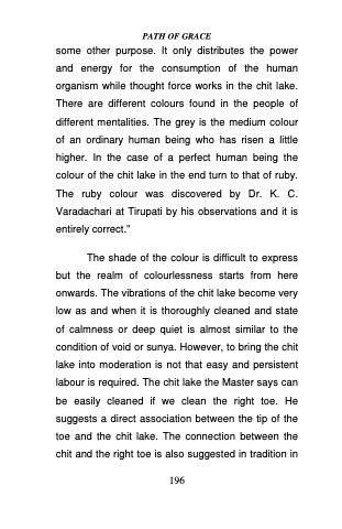 some other purpose. It only distributes the power and energy for the consumption of the human organism while thought force works in the chit lake. There are different colours found in the people of different mentalities. The grey is the medium colour of an ordinary human being who has risen a little higher. In the case of a perfect human being the colour of the chit lake in the end turn to that of ruby. The ruby colour was discovered by Dr. K. C. Varadachari at Tirupati by his observations and it is entirely correct.”