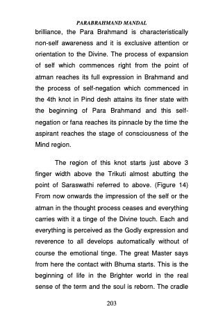 brilliance, the Para Brahmand is characteristically non-self awareness and it is exclusive attention or orientation to the Divine. The process of expansion of self which commences right from the point of atman reaches its full expression in Brahmand and the process of self-negation which commenced in the 4th knot in Pind desh attains its finer state with the beginning of Para Brahmand and this self- negation or fana reaches its pinnacle by the time the aspirant reaches the stage of consciousness of the Mind region.