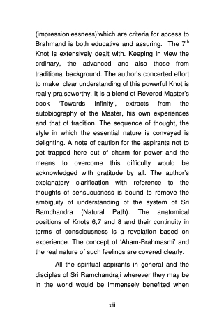 (impressionlessness)’which are criteria for access to Brahmand is both educative and assuring. The 7th Knot is extensively dealt with. Keeping in view the ordinary, the advanced and also those from traditional background. The author’s concerted effort to make clear understanding of this powerful Knot is really praiseworthy. It is a blend of Revered Master’s book ‘T owards Infinity’, extracts from the autobiography of the Master, his own experiences and that of tradition. The sequence of thought, the style in which the essential nature is conveyed is delighting. A note of caution for the aspirants not to get trapped here out of charm for power and the means to overcome this difficulty would be acknowledged with gratitude by all. The author’s explanatory clarification with reference to the thoughts of sensuousness is bound to remove the ambiguity of understanding of the system of Sri Ramchandra (Natural Path). The anatomical positions of Knots 6,7 and 8 and their continuity in terms of consciousness is a revelation based on experience. The concept of ‘Aham-Brahmasmi’ and the real nature of such feelings are covered clearly.