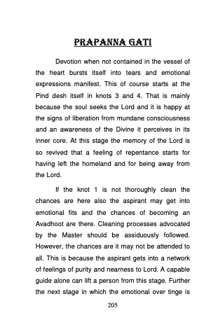 If the knot 1 is not thoroughly clean the chances are here also the aspirant may get into emotional fits and the chances of becoming an Avadhoot are there. Cleaning processes advocated by the Master should be assiduously followed. However, the chances are it may not be attended to all. This is because the aspirant gets into a network of feelings of purity and nearness to Lord. A capable guide alone can lift a person from this stage. Further the next stage in which the emotional over tinge is