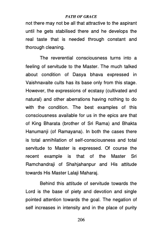 The reverential consciousness turns into a feeling of servitude to the Master. The much talked about condition of Dasya bhava expressed in Vaishnavaite cults has its base only from this stage. However, the expressions of ecstasy (cultivated and natural) and other aberrations having nothing to do with the condition. The best examples of this consciousness available for us in the epics are that of King Bharata (brother of Sri Rama) and Bhakta Hanumanji (of Ramayana). In both the cases there is total annihilation of self-consciousness and total servitude to Master is expressed. Of course the recent example is that of the Master Sri Ramchandraji of Shahjahanpur and His attitude towards His Master Lalaji Maharaj.