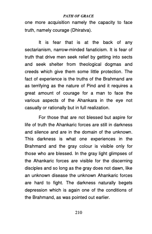 It is fear that is at the back of any sectarianism, narrow-minded fanaticism. It is fear of truth that drive men seek relief by getting into sects and seek shelter from theological dogmas and creeds which give them some little protection. The fact of experience is the truths of the Brahmand are as terrifying as the nature of Pind and it requires a great amount of courage for a man to face the various aspects of the Ahankara in the eye not casually or rationally but in full realization.