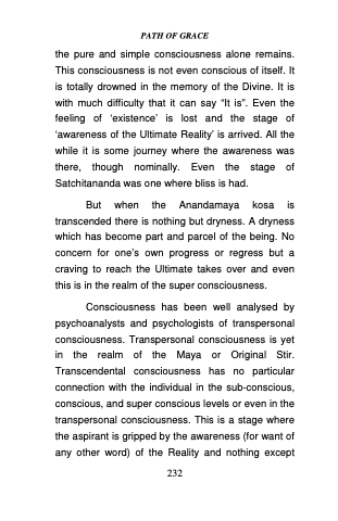 the pure and simple consciousness alone remains. This consciousness is not even conscious of itself. It is totally drowned in the memory of the Divine. It is with much difficulty that it can say “It is”. Even the feeling of ‘existence’ is lost and the stage of ‘awareness of the Ultimate Reality’ is arrived. All the while it is some journey where the awareness was there, though nominally. Even the stage of Satchitananda was one where bliss is had.