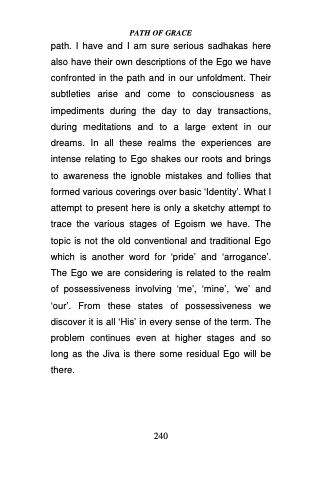 path. I have and I am sure serious sadhakas here also have their own descriptions of the Ego we have confronted in the path and in our unfoldment. Their subtleties arise and come to consciousness as impediments during the day to day transactions, during meditations and to a large extent in our dreams. In all these realms the experiences are intense relating to Ego shakes our roots and brings to awareness the ignoble mistakes and follies that formed various coverings over basic ‘Identity’. What I attempt to present here is only a sketchy attempt to trace the various stages of Egoism we have. The topic is not the old conventional and traditional Ego which is another word for ‘pride’ and ‘arrogance’. The Ego we are considering is related to the realm of possessiveness involving ‘me’, ‘mine’, ‘we’ and ‘our’. From these states of possessiveness we discover it is all ‘His’ in every sense of the term. The problem continues even at higher stages and so long as the Jiva is there some residual Ego will be there.