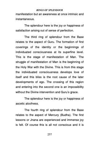The third ring of splendour from the Base relates to the aspect of Guru. The formation of first coverings of the identity or the beginnings of individuated consciousness at its superfine level. This is the stage of manifestation of Man. The struggle of manifestation of Man is the beginning of the Holy War with the Divine. This is from this stage the individuated consciousness develops love of itself and this bliss is the root cause of the later developments of ego. The crossing of this region and entering into the second one is an impossibility without the Divine intervention and Guru’s grace.