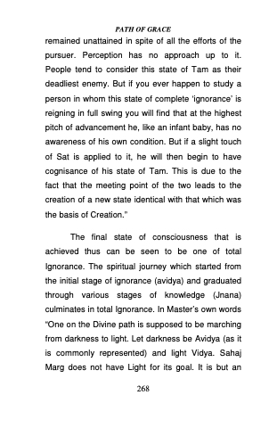 remained unattained in spite of all the efforts of the pursuer. Perception has no approach up to it. People tend to consider this state of Tam as their deadliest enemy. But if you ever happen to study a person in whom this state of complete ‘ignorance’ is reigning in full swing you will find that at the highest pitch of advancement he, like an infant baby, has no awareness of his own condition. But if a slight touch of Sat is applied to it, he will then begin to have cognisance of his state of Tam. This is due to the fact that the meeting point of the two leads to the creation of a new state identical with that which was the basis of Creation.”
