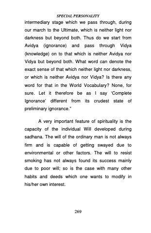 intermediary stage which we pass through, during our march to the Ultimate, which is neither light nor darkness but beyond both. Thus do we start from Avidya (ignorance) and pass through Vidya (knowledge) on to that which is neither Avidya nor Vidya but beyond both. What word can denote the exact sense of that which neither light nor darkness, or which is neither Avidya nor Vidya? Is there any word for that in the World Vocabulary? None, for sure. Let it therefore be as I say ‘Complete Ignorance’ different from its crudest state of preliminary ignorance.”