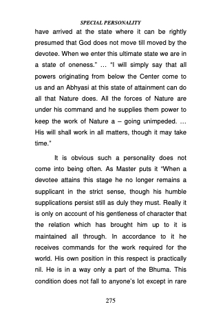 have arrived at the state where it can be rightly presumed that God does not move till moved by the devotee. When we enter this ultimate state we are in a state of oneness.” ... “I will simply say that all powers originating from below the Center come to us and an Abhyasi at this state of attainment can do all that Nature does. All the forces of Nature are under his command and he supplies them power to keep the work of Nature a – going unimpeded. ... His will shall work in all matters, though it may take time.”