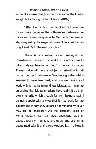 There is a common notion amongst that Pranahuti is unique to us and this is not known to others. Master has written that “ .. the long forgotten Transmission will be the subject of attention for all human beings in existence. We have got that which seemed to have been lost, and now we have it and work with it, thanks to my Great Master..... It may be surprising that Mohammedans here claim it as their own originality which though far from being a fact, I do not dispute with a view that it may work for the betterment of humanity at large not minding whoever may be its originator. All the different sects of Mohammedans (72 in all) have transmission as their base, directly or indirectly and every one of them is acquainted with it and acknowledges it........ Now it