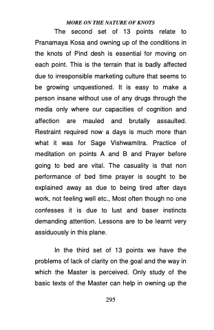 The second set of 13 points relate to Pranamaya Kosa and owning up of the conditions in the knots of Pind desh is essential for moving on each point. This is the terrain that is badly affected due to irresponsible marketing culture that seems to be growing unquestioned. It is easy to make a person insane without use of any drugs through the media only where our capacities of cognition and affection are mauled and brutally assaulted. Restraint required now a days is much more than what it was for Sage Vishwamitra. Practice of meditation on points A and B and Prayer before going to bed are vital. The casuality is that non performance of bed time prayer is sought to be explained away as due to being tired after days work, not feeling well etc., Most often though no one confesses it is due to lust and baser instincts demanding attention. Lessons are to be learnt very assiduously in this plane.