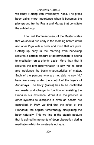 The First Commandment of the Master states that we should rise early in the morning before dawn and offer Puja with a body and mind that are pure. Getting up early in the morning from bed/sleep requires a certain amount of determination to attend to meditation on a priority basis. More than that it requires the firm determination to say ‘No’ to sloth and indolence the basic characteristics of matter. Such of the persons who are not able to say ‘No’ here are surely under the control of the layers of Annamaya. The body (sarira) has to be controlled and made to discharge its function of assisting the Prana in our existence. While it is the practice in other systems to discipline it even as beasts are controlled, in PAM we find that the influx of the Pranahuti, the original force/energy disciplining the body naturally. This we find in the steady posture that is gained in moments of deep absorption during meditation which fortunately is not rare.