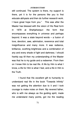 still continued. The system is there, my support is there, yet it is for the persons like you to first educate abhyasis and then do further research work. I have great hope from you.” This was after the Master has blessed with the vision of His Real form in 1979 at Shahjahanpur: the form that encompasses everything in universe and perhaps beyond. It was a state beyond words – a fusion of love, devotion, awe, admiration, reverence and total insignificance and many more. It was radiance, brilliance, soothing brightness and a combination of any and every shade of light and darkness. I should frankly say till then my understanding of the Master was that he is my guide and a redeemer. From then on I knew Him to be real life. A life by Him is what I know, a life for Him is what I feel, and a life in Him is the Truth.