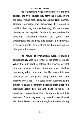 The Pranamaya Kosa is the sphere of the five senses, the five Pranas; they form this cover. There are Upa-Pranas also. They are called: Nag, Kurma, Gridhra, Devadatta and Dhananjaya. It is stated in tradition that Nag causes belching, Kurma causes blinking of the eyelids, Gridhra is responsible for sneezing, Devadatta causes the yawn, and Dhananjaya fills the body and causes it to grow fat. Even after death, these affect the body and cause changes in the corpse.
