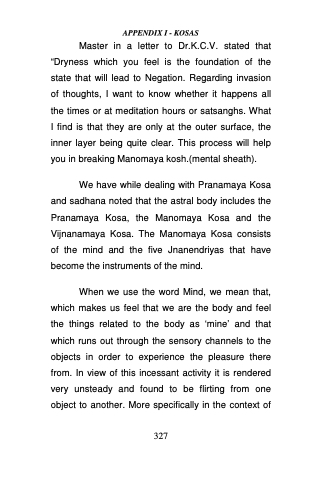 Master in a letter to Dr.K.C.V. stated that “Dryness which you feel is the foundation of the state that will lead to Negation. Regarding invasion of thoughts, I want to know whether it happens all the times or at meditation hours or satsanghs. What I find is that they are only at the outer surface, the inner layer being quite clear. This process will help you in breaking Manomaya kosh.(mental sheath).