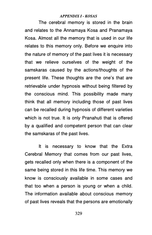 The cerebral memory is stored in the brain and relates to the Annamaya Kosa and Pranamaya Kosa. Almost all the memory that is used in our life relates to this memory only. Before we enquire into the nature of memory of the past lives it is necessary that we relieve ourselves of the weight of the samskaras caused by the actions/thoughts of the present life. These thoughts are the one’s that are retrievable under hypnosis without being filtered by the conscious mind. This possibility made many think that all memory including those of past lives can be recalled during hypnosis of different varieties which is not true. It is only Pranahuti that is offered by a qualified and competent person that can clear the samskaras of the past lives.