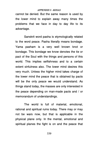Sanskrit word pasha is etymologically related to the word peace. Pasha literally means bondage. Yama pasham is a very well known knot or bondage. This bondage we know denotes the tie or pact of the Soul with the things and persons of this world. This implies selfishness and to a certain extent sinfulness also. The lower mind desires this very much. Unless the higher mind takes charge of the lower mind the peace that is obtained by pacts will be the only peace we would understand. As things stand today, the masses are only interested in the peace depending on man-made pacts and / or memorandum of understandings.