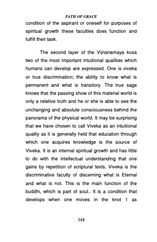 The second layer of the Vijnanamaya kosa two of the most important intuitional qualities which humans can develop are expressed. One is viveka or true discrimination; the ability to know what is permanent and what is transitory. The true sage knows that the passing show of this material world is only a relative truth and he or she is able to see the unchanging and absolute consciousness behind the panorama of the physical world. It may be surprising that we have chosen to call Viveka as an intuitional quality as it is generally held that education through which one acquires knowledge is the source of Viveka. It is an internal spiritual growth and has little to do with the intellectual understanding that one gains by repetition of scriptural texts. Viveka is the discriminative faculty of discerning what is Eternal and what is not. This is the main function of the buddhi, which is part of soul.. It is a condition that develops when one moves in the knot 1 as